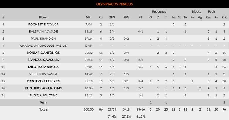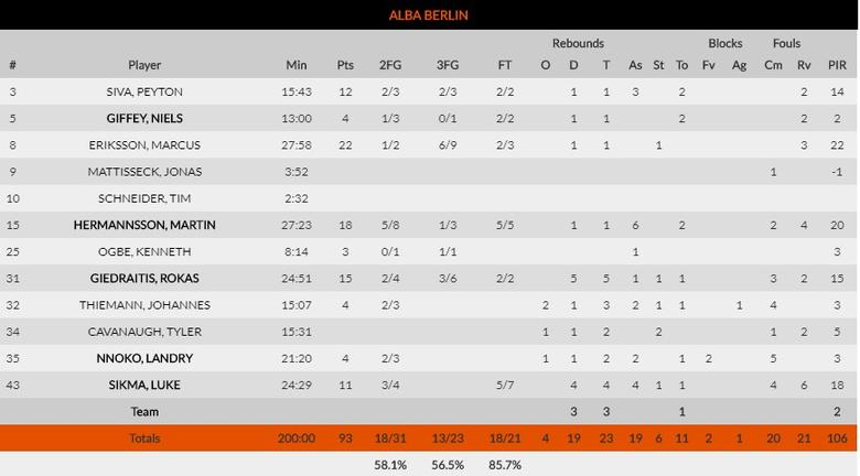 Hoy si tuvo premio el juego ofensivo del Alba de Aíto. Los alemanes estaban suscitando continuamente halagos por su estilo coral y ofensivo pero esto solo se había traducido en cinco victorias. Aún así todo el club, incluyendo directiva, aficionados y jugadores, nunca ha dejado de creer en el modelo del entrenador madrileño y de Himar Ojeda. Olympiacos es todo lo contrario en cuanto a estabilidad y hoy se producía el debut de Bartzokas, tercer técnico en dirigir a los griegos este curso. El partido fue muy disputado y se decidió en el último cuarto, tras remontar los locales en el tercer período la ventaja alemana. Como casi siempre el dúo interior formado por Printezis y Milutinov rindió a gran nivel, sumando 54 de valoración, y además contaron con un buen Spanoulis (18). Pero enfrente se encontraron al mejor Eriksson desde su fichaje por Alba, que los acribilló con 6 de 9 en triples, y con un Hermannsson, que lideró en el último cuarto junto a Luke Sikma. Giedraitis y Peyton Siva también contribuyeron a los 93 puntos anotados y al gran 13 de 23 en triples que fue decisivo.