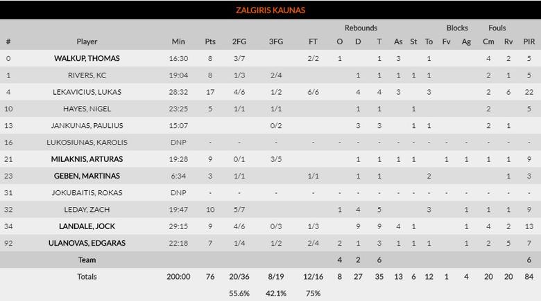 El Stark Arena de Belgrado vivió un partido muy disputado que no se decidió hasta el último cuarto. Al descanso se llegó con empate a 38 y se entró al período decisivo con 4 de ventaja para los de Jasikevicius. Fue un duelo de escasa calidad ofensiva, en el que solo sumaron doble dígitos en puntos un desacertado Lorenzo Brown, Zach Leday y Lukas Lekavicius, que fue la estrella del partido con 17 puntos y 22 de valoración. El eléctrico base anotó 7 de los 19 puntos de los lituanos en el primer cuarto, siendo el jugador decisivo.