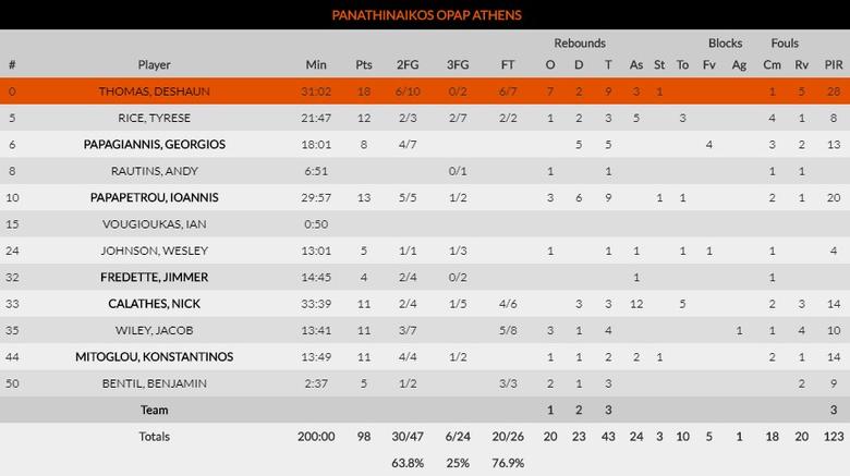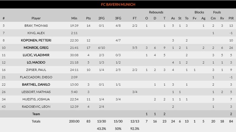 Los griegos comenzaron con el gran nivel ofensivo que muestran desde la vuela de Pitino y parecía que podíamos ver una victoria cómoda. Pero la vuelta de TJ Bray le sentó muy bien al Bayern, que además tuvo un acierto sorprendente desde la línea de tres. Monroe se encontraba a gusto y dominaba las zonas para que los alemanes anotarona 35 puntos en el segundo cuarto. En el tercero se igualó el duelo pero los de Oliver Kostic seguían metiendo la mitad de sus triples (acabarían con 15 de 30) pero en el último los visitantes se vinieron abajo y anotaron solo 8 puntos. Calathes dominó con su doble doble habitual, que hoy fue de 11 y 12, pero el protagonista fue para DeShaun Thomas, con 18 puntos, 9 rebotes y 28 de valoración. Buen papel en la zona por parte de Papagiannis, Wiley y Mitoglou, además de otro gran partido de Papapetrou (20 de valoración). Por parte alemana hubo hasta cinco jugadores en dobles dígitos de anotación y Monroe se fue a 26 de valoración, pero todo quedó en nada ante su hundimiento en los últimos diez minutos.