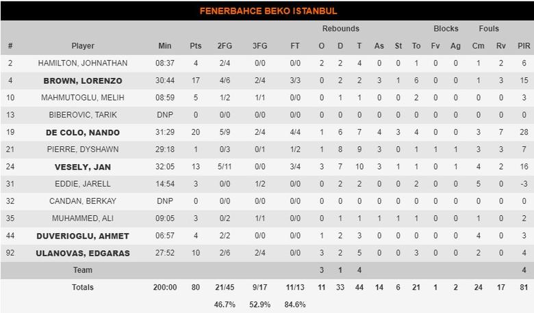 Por el contrario, Fenerbahce suma su segunda victoria sin necesidad de practicar un baloncesto espectacular pero jugando sin presión, asimilando bien los sistemas de Kokoskov y con el ya mencionado dominio del rebote. Nando De Colo volvió a ser el líder con un gran partido traducido en 20 puntos y 28 de valoración, bien acompañado otra vez por Lorenzo Brown y Jan Vesely.