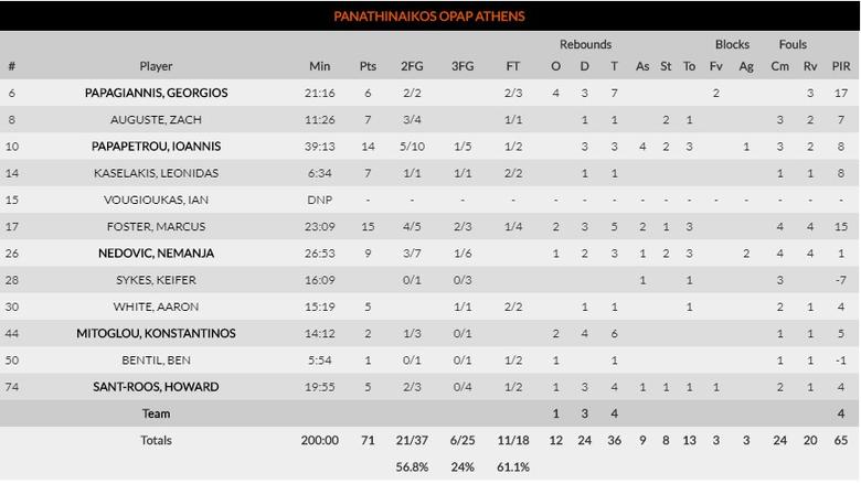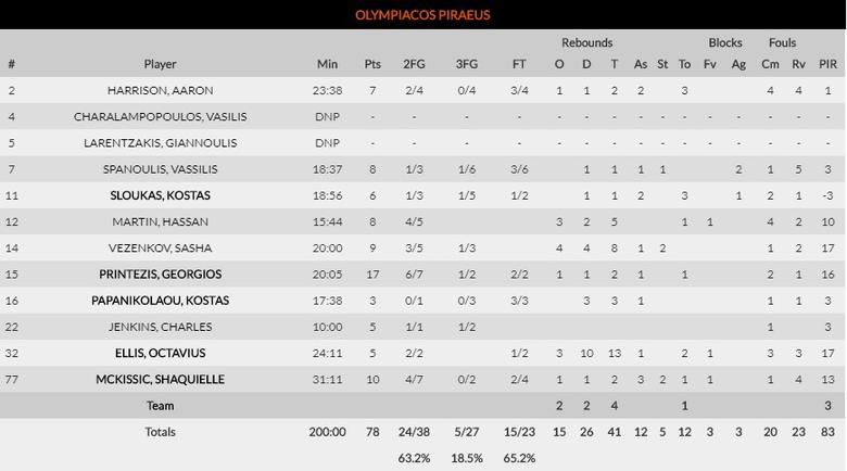 Los de Kostas Sloukas llevaron el mando del partido todo el tiempo, aunque no fue gracias al retornado base que sigue sin mostrar su nivel en este inicio de temporada. Pero Olympiacos contó con un gran partido de tres de sus americanos, con Ellis, McKissic y Martin en dobles dígitos en anotación y Ellis dominando la zona con 13 rebotes. Vezenkov y Printezis se turnaron en el puesto de cuatro para ser los mejores, con el veterano griego liderando la anotación con 17. Papagiannis en la zona y Foster y Papapetrou en la anotación fueron los que plantaron cara.