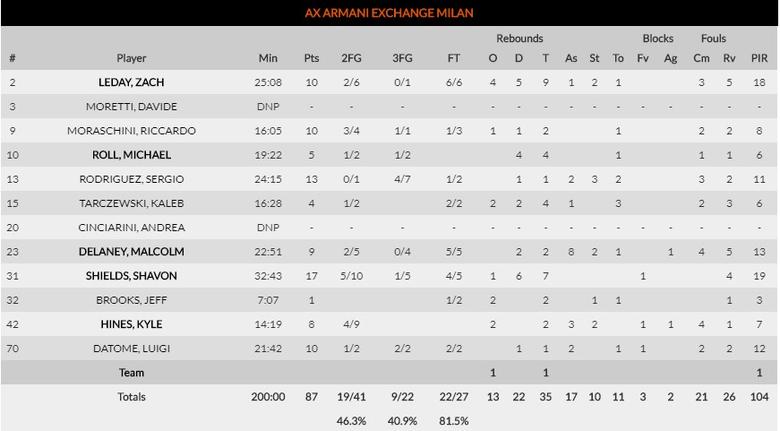 Tras su victoria en los últimos segundos de la prórroga de la primera jornada, los de Messina no quisieron hoy sustos y dominaron el partido ganando todos los cuartos. Una gran actuación coral con hasta cinco jugadores en dobles dígitos de valoración fue la clave, con Shavon Shields siendo el mejor con 17 puntos y 19 de valoración, mientras que Leday dominaba la zona y la pareja formada por Delaney y el Chacho dirigían la orquesta.