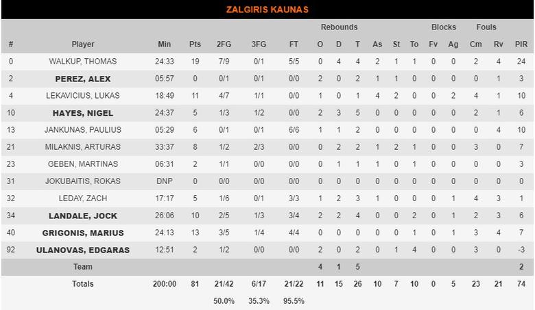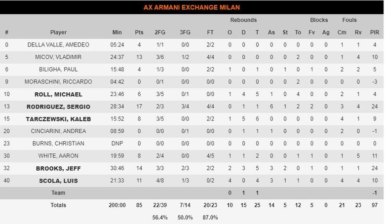 Sergio Rodríguez lideró la primera victoria del Armani Milán de Messina con 17 puntos, 6 asistencias y 24 de valoración. Jeff Brooks fue su mejor acompañante con otros 24 créditos. Los italianos aún no han asentado ni su juego ni sus roles, a la vez que sufren las bajas de jugadores importantes como Mack, Nedovic y Gudaitis. Por parte lituana, Jasikevicius aún no ha conseguido conjuntar a los recién llegados y hoy fue Thomas Walkup el que batalló, por momentos en solitario, para recibir luego la ayuda de Grigonis y de Landale, que está teniendo un rendimiento muy irregular. Aún así los lituanos tuvieron opciones casi hasta el último momento, pero tanto ellos como los milanistas tendrán que mejorar mucho si quieren ir hacia arriba, visto el rendimiento de otros equipos.