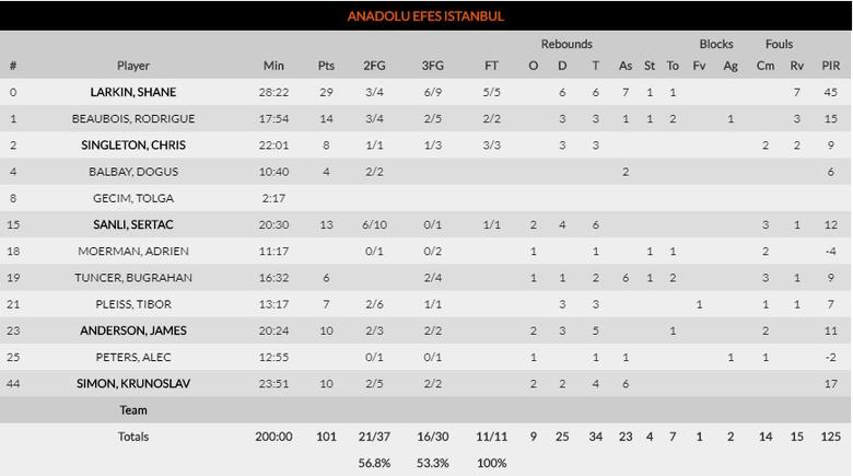 El partido entre turcos y franceses fue una exhibición individual de Shane Larkin y de todo el equipo de Ataman. Se agotan los calificativos sobre el estado de forma actual tanto del ex de Baskonia como de la plantilla del finalista de la pasada temporada. Larkin se fue a unos números de 29 puntos, con solo cuatro fallos en el tiro, 6 rebotes, 7 asistencias y 45 de valoración, que sería la mejor marca de la temporada de no ser por los 53 que consiguió el propio Shane contra Bayern. La paliza pudo ser mayor de no ser por algunos momentos de relajación de los turcos y eso que los franceses hicieron lo que pudieron. Como otras veces, la mejor noticia fue la calidad que sigue mostrando el joven Theo Maledon, que hoy se fue a 5 puntos, 6 rebotes y 10 asistencias.