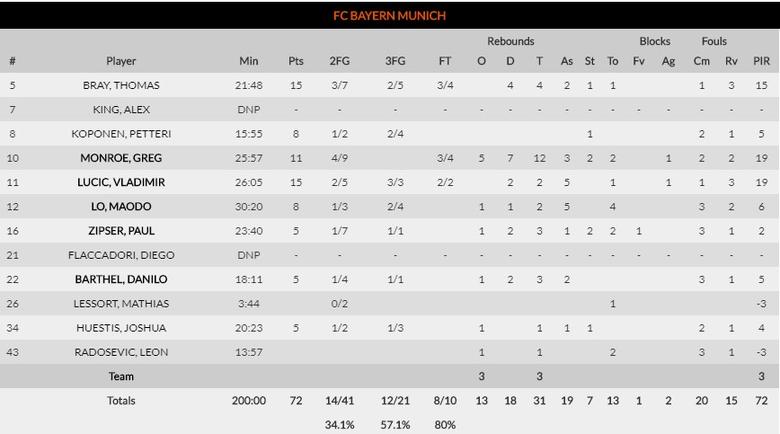 El duelo entre griegos y alemanes fue igualado hasta el último cuarto, con el Bayern volviendo a mostrar una buena cara con la recuperación de TJ Bray (15 puntos y 15 de valoración), el trabajo habitual de Lucic y un gran Greg Monroe. Pero como en el otro partido de la jornada doble, en el último cuarto los visitantes se vinieron abajo y recibieron un parcial de 35 a 19. Los alemanes acabaran la jornada doble como colistas.