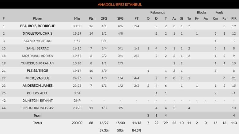 Una semana más los de Ataman siguen intratables. Esta vez tuvieron la baja de Shane Larkin, MVP hasta el momento de la temporada, y aún así no tuvieron mayores dificultades para ganar ante el colista. Vasilije Micic sigue cogiendo la forma y fue el conductor del ataque turco con 8 asistencias y 21 de valoración, mientras Beaubois y Singleton asumían más tiros y sumaban 16 y 14 puntos con un 8 de 14 conjunto en triples. Lucic y Maodo Lo fueron otra vez los mejores de Bayern, con Monroe desacertado con 5 puntos y 2 de 7 en tiros.