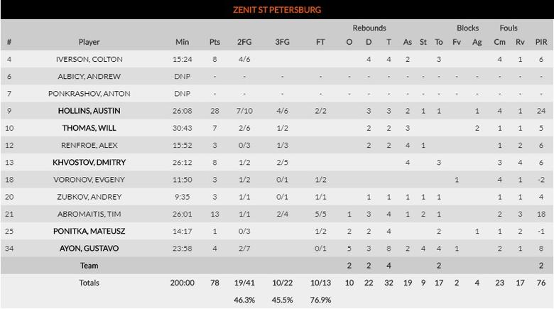 El equipo de Xavi Pascual compitió contra el actual campeón, llegando a ponerse 79-74 a falta de tres minutos y 82-78 quedando 32 segundos, pero un otra vez inspirado Mike James impidió que el entrenador de Gavà se estrenase con Zenit. El club de San Petersburgo plantó cara gracias a la brillante actuación de Austin Hollins, que se fue hasta 28 puntos, pero hoy no contó con la buena actuación del juego interior ex ACB, ya que Ayón, Iverson y Thomas estuvieron muy grises, siendo Abromaitis el único escudero fiable (13 puntos y 18 de valoración).