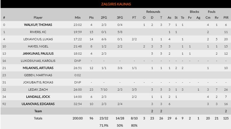 Los lituanos dominaron el partido desde el principio con un gran primer cuarto (29-15) y, exceptuando el tercer cuarto, el duelo fue suyo en todo momento. Zalgiris tuvo hasta siete jugadores en dobles dígitos de valoración, liderados por Zach Leday (26) y Lukas Lekavicius (20). Jerebko, Timma y Shved fueron los mejores de Khimki y plantaron cara, pero los lituanos fueron mucho más equipo.