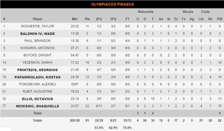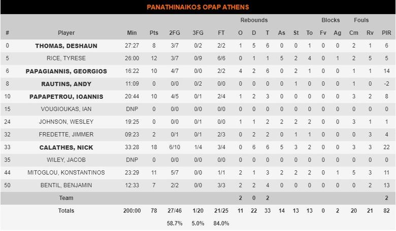 Panathinaikos tuvo la última jugada para enviar el partido a la prórroga con ocho segundos pero Deshuan Thomas no acertó en su intento. Calathes fue otra vez el mejor pero le costó encontrar a sus compañeros con solo cinco asistencias, o, más bien, cuando abrió para el tiro exterior sus compañeros fallaron. El 1 de 20 en triples de los de Pitino fue el factor negativo más decisivo para su derrota.