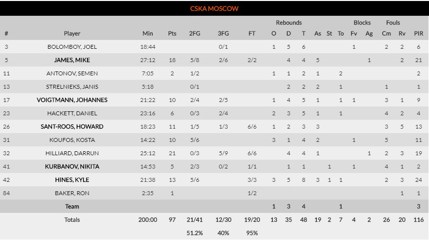 CSKA realizó un gran partido coral, con hasta 6 jugadores en dobles dígitos de anotación y 5 en valoración, con Hines y James liderando en sus respectivas facetas y Hilliard tirando muy bien con un 5 de 6 en triples. Los rusos siguen en la pelea por el cuarto puesto y estarán pendientes de lo que haga Maccabi.