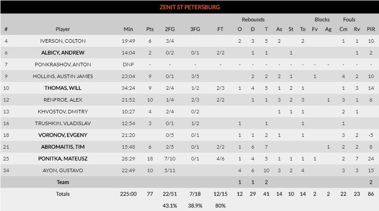 En el equipo griego los nuevos fichajes no están rindiendo como se esperaba y que buscará fichar un entrenador para revertir esta situación tras la salida de David Blatt. Nikola Milutinov volvió a rendir a un nivel espectacular con 16 puntos, 16 rebotes y 30 de valoración, pero el pívot serbio está muy solo, ya que solo Printezis alcanzó la decena en valoración. Kevin Punter se fue a 16 puntos pero con un 5 de 21 en tiros de campo, mientras que fichajes como Brandon Paul, Augustine Rubit o Wade Baldwin no están aportando prácticamente nada. El Zenit destacó por lo contrario, ya que hasta 5 jugadores alcanzaron o superaron la decena con Mateusz Ponitka como líder, con 18 puntos y 24 de valoración. Los interiores ex ACB compensaron con un trabajo coral la actuación de Milutinov, con Ayón destacando con un doble doble de 10 puntos y 10 rebotes para 15 de valoración, apoyado por Will Thomas (14 de valoración) y Colton Iverson (10).