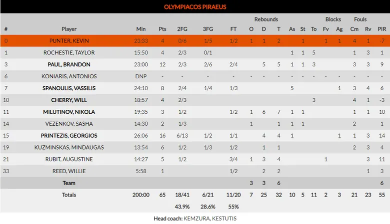 Maccabi FOX Tel Aviv asalta El Pireo y se lleva una victoria cómoda después de una igualada primera parte. Los israelís empezaron por debajo en el marcador pero cogieron el liderato en el marcador al final del primer cuarto y no lo soltaron. Tyler Dorsey y Scottie Wilbekin, los grandes destacados hoy en su equipo se fueron con 9 puntos al descanso a pesar de un apretado 40-45. La segunda parte, en cambio, sería bien distinta con los de Sfairopoulos marchándose en el tercer cuarto y dando rienda suelta a su juego en el último, jugando a placer.