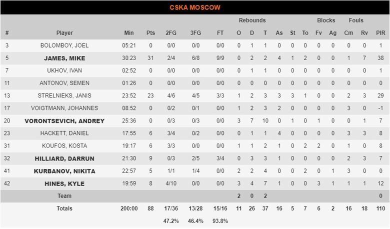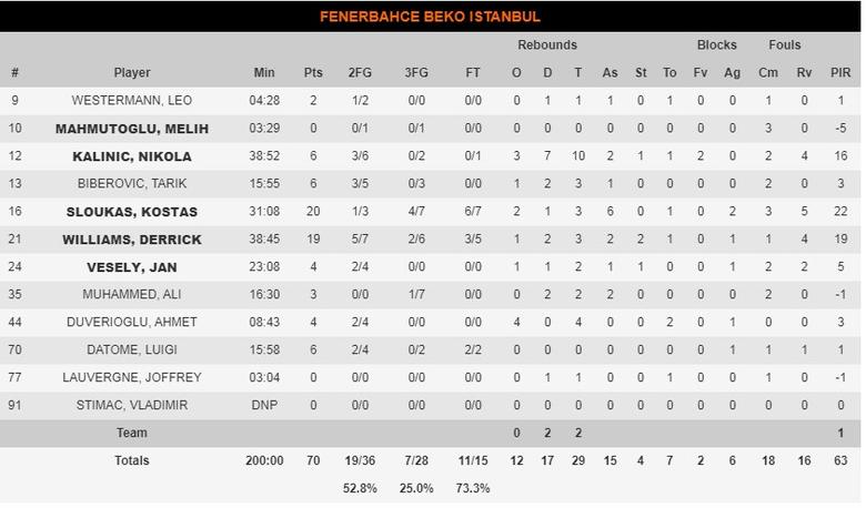 Parecía previsible una victoria del CSKA al enfrentarse a este Fenerbahce en horas bajas y que además llegaba sin su estrella Nando De Colo. Pero los de Obradovic fueron aguantando en la primera parte gracias a una buena defensa y a un recuperado Kostas Sloukas (20 puntos, 6 asistencias y 22 de valoración), que conectaba muy bien con Derrick Williams (19 puntos y 19 de valoración). Pero esta claro que los turcos están desconocidos esta temporada y jugadores como Vesely, Datome o Ali no dan encontrado su nivel habitual. Kalinic (10 rebotes y 16 de valoración) apoyaba en la intendencia pero este trío era muy poco para oponer a un CSKA muy regular en su rendimiento que se fue distanciando en la segunda parte para otra cómoda victoria. Los actuales campeones disfrutaron del primer gran partido de Janis Strelnieks (23 puntos y 29 de valoración) para ser el escudero perfecto en una nueva exhibición de Mike James (31 y 38). A destacar también los buenos minutos del joven Tarik Biberovic (01) por parte de los turcos y la actuación de Kosta Koufos, que ya se va integrando tras su lesión y aportando cosas positivas a los de Itoudis.