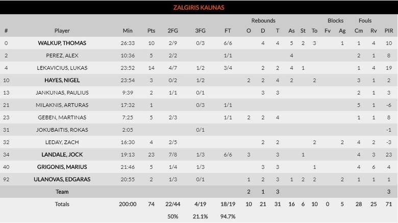 Vassilis Spanoulis hoy puede decir eso de “el que tuvo retuvo”. A la estrella griega se le nota el paso del tiempo esta temporada pero hoy anotó 16 puntos y repartió 7 asistencias. Lukas Lekavicius le dió la réplica en el juego exterior de Zalgiris con 19 de valoración, pero el protagonismo del partido lo tuvo un duelo interior. Jock Landale realizó su mejor partido con los lituanos, anotando 23 puntos, pero la victoria fue para un dominante Milutinov. El pívot serbio sigue rindiendo como un reloj y hoy se fue 14 puntos, 8 rebotes, 2 asistencias, 2 tapones y 27 de valoración. Además estuvo mejor acompañado ya que Brandon Paul, Printezis y el casi recién llegado Willie Reed estuvieron a buen nivel, mientras que por los de Jasikevicius solo Walkup apoyó al base y al pívot.