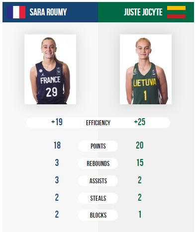 En la otra semifinal se viviría uno de los choques más igualados de lo que llevamos de campeonato en el que tanto la selección francesa como la lituana mantenían las fuerzas igualadas en todo momento. Sin embargo, fue el conjunto báltico el que con una magnífica Juste Jocyte (20 puntos y 15 rebotes) lograría el triunfo final con 2 tiros libres y un tapón en los últimos 10 segundos de la propia Jocyte. De este modo, Lituania se imponía por 54-51 y se metía en la primera final sub 16 de su historia.
