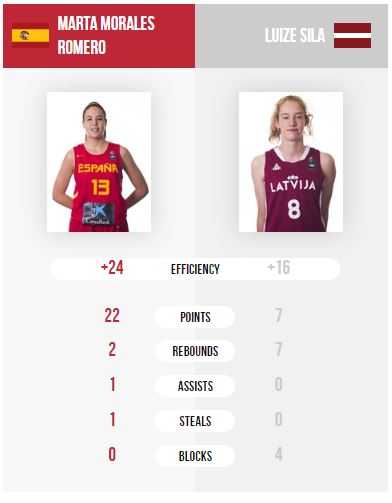 Las jugadoras más destacadas en este partido por el conjunto español fueron Marta Morales (22 puntos con 7/8 en tiros de campo para 24 de valoración en 20 minutos), Anna Prim (12 puntos, 5 asistencias y 5 robos en 18 minutos) y Txell Alarcón (13 puntos y 4 rebotes en 18 minutos).