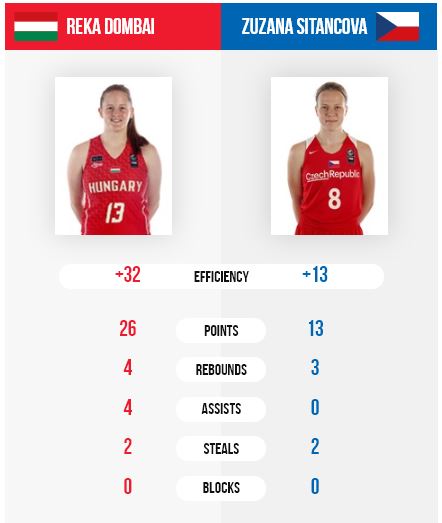 El último choque de cuartos de final fue el disputado entre las selecciones de Hungría y República Checa. En este lance, las húngaras demostraron nuevamente que son una de las grandes favoritas para alzar el título y con un ritmo anotador demoledor en los tres primeros cuartos (28, 29 y 23 puntos respectivamente) lograron una ventaja de más de 30 puntos que les sirvió para poder dejarse ir en el último, venciendo el choque por 90-61, siendo Roka Dombai (26 puntos, 4 rebotes y 4 asistencias) y Aliz Varga (12 puntos y 8 rebotes) sus mejores jugadoras.