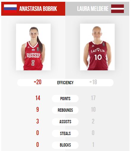 El segundo partido de la tarde se presumía igualado entre Rusia y Letonia pero nada más lejos de la realidad, ya que las rusas dominaban desde el comienzo y ya al descanso tenían una ventaja de 10 puntos frente al hasta entonces invicto conjunto letón. En la segunda parte, lejos de reducirse la diferencia, esta fue aumentando ya que las rusas se mostraban intratables con unas destacadas Anastasiia Bobrik (14 puntos y 9 rebotes) y Alexandra Andrushchenko (15 puntos y 6 rebotes), de manera que el encuentro terminaba con el marcador señalando un 79-52.