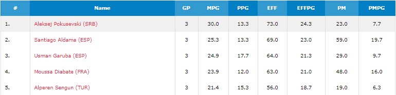 Aleksej Pokusevski lidera la clasificación de valoración por partido con 24’3. Comenzó fuerte con 31 en su primer partido y luego se ha mantenido regular con 19 y 23. Su valoración viene sobre todo de su capacidad reboteadora (3º) y taponadora (1º) aunque también es un buen anotador (11º) y hay que destacar su capacidad de pase con 5’7 (5º) siendo un jugador de 2.11.