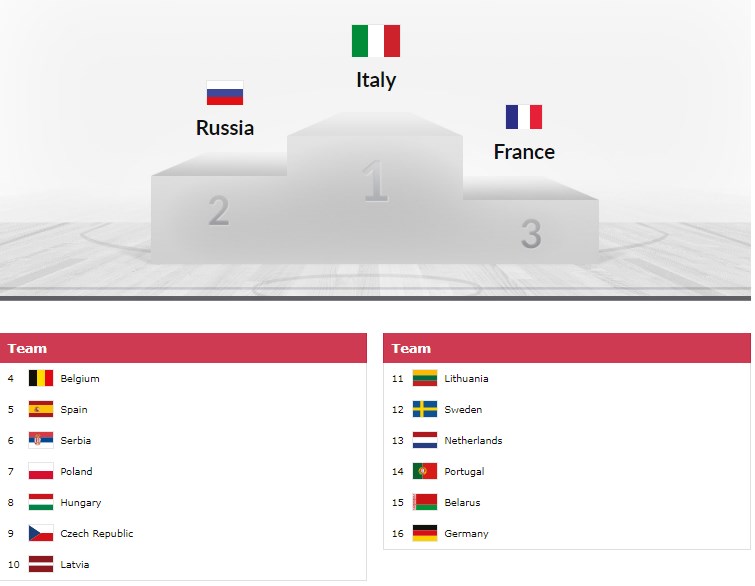 La selección española mantuvo la concentración hasta el final del campeonato para llevarse un meritorio quinto puesto y finalizar con solo una derrota en su casillero. Su vérdugo, Italia, se hizo con el Oro al ganar una emocionante y disputada final a Rusia. Constanza Verona fue la mejor de la final con 28 de valoración, bien apoyada por Madera (16) y Orsili (13). Por las rusas, la más destacada fue Valentina Kozhukhar con 19.