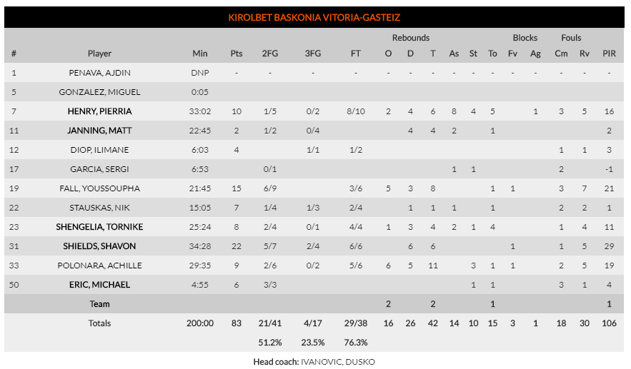 Shavon Shields para decidir: Si alguien estuvo seguro y acertado en el Kirolbet Baskonia fue el alero Shavon Shields. El jugador americano tuvo en Pierria Henry a su mejor aliado, por lo que podría ser un MVP compartido. Sin embargo, los 22 puntos anotados, junto con el 100% de acierto en tiros libres y el 7/11 en tiros de campo le sirven para ser de nuevo MVP del partido.