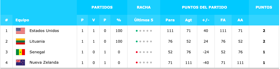 | Grupo A: SENEGAL 52-76 LITUANIA EEUU 111-71 NUEVA ZELANDA | – – |
