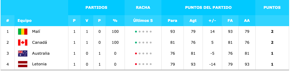 MALÍ 93-79 LETONIA AUSTRALIA 76-81 CANADÁ |