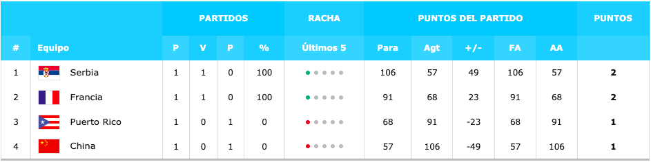 Grupo D: CHINA 57-106 SERBIA PUERTO RICO 68-91 FRANCIA |