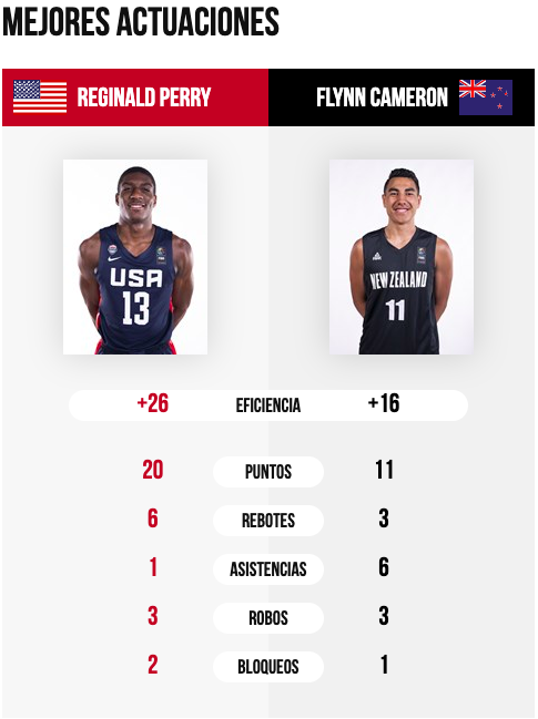 EEUU ha presentado su candidatura al título por todo lo alto. Hasta ocho jugadores de los americanos han superado el +10 de valoración y cuatro de ellos han superado los diez puntos. Reginald Perry ha sido el MVP del encuentro, aunque es muy posible que el jugador más destacado del equipo estadounidense vaya variando en cada jornada con otros jugadores como Jalen Green (12 puntos y 5 rebotes) o Isaac Likekele (9 puntos y 8 asistencias).