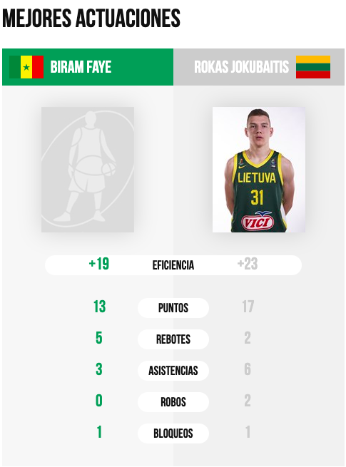 En el otro partido del grupo, se ha podido contemplar en el choque entre Senegal y Lituania un duelo donde los sistemas de juegos eran totalmente dispares. Jokubaitis desbordó todo su talento para ser el claro dominador del encuentro, desesperando a los senegaleses pese a su enorme potencial físico. El tándem Faye-Sylla se vio muy solo, a pesar de haber valorado +19 y +14 respectivamente. Mañana Canadá puede ser una auténtica pesadilla para los africanos.