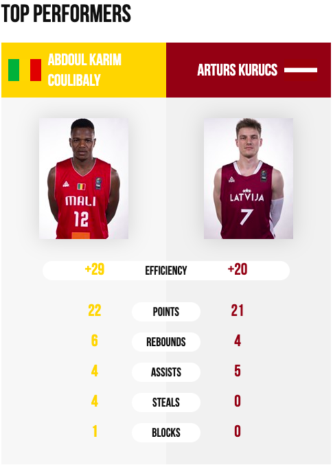 Uno de los eventos más históricos de este Mundial se pudo ver en el grupo B: desde 2007 Malí no lograba una victoria en una Copa del Mundo U19. Sin Omar Ballo, líder indescutible de la selección africana, Abdoul Karim realizó un partido de ensueño con 26 puntos, 6 rebotes y 4 asistencias. El baskonista, Arturs Kurucs, realizó un gran partido con 21 puntos y 5 asistencias. La falta de Arturs Zargars puede ser un handicap muy negativo en la selección letona. Perder mañana frente a Australia, podría suponer la eliminación directa.