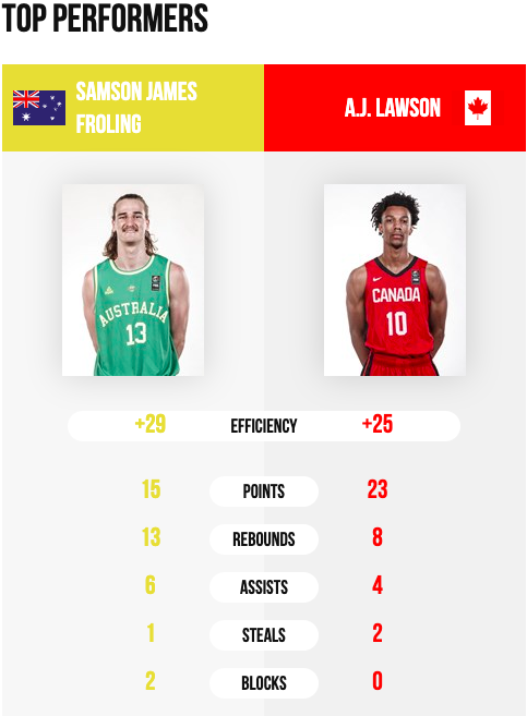 El duelo entre Lawson y Froling ha sido uno de los choques más espectaculares de la jornada. Pese a que el australiano realizó un mejor encuentro, los canadienses superaron a sus rivales en los últimos momentos del partido. El último cuarto fue fundamental en la resolución del encuentro, después de que los australianos empataran el partido con un triple en los últimos instantes del tercer cuarto.
