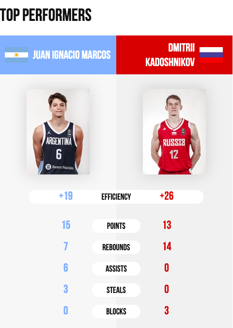 Argentina y Rusia ofrecieron un espectacular encuentro lleno de talento y fuerza física. El líder en esta ocasión de la selección de América del Sur fue Juan Ignacio Marcos, que parecía encontrar su mejor juego desde el primer momento y coqueteaba con el triple-doble con 15 puntos, 7 rebotes y 6 asistencias. Una pena el desacierto desde el 6.75 con un 1/8. Los rusos dejaron grandes destellos de talento con Kadoshnikov (13 puntos y 14 rebotes) y Ershov (22 puntos y 6 rebotes). Todos pendientes a la lesión del blaugrana, Leandro Bolmaro, que tras anotar 16 puntos en apenas 12 minutos, se marchaba a los vestuarios debido a una lesión en el tobillo.