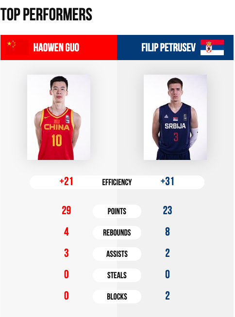 Los asiáticos no supieron frenar a los serbios en ningún momento. Haowen Guo fue el único jugador de China que superó el +10 de valoración con 29 puntos y 4 rebotes. Serbia se muestra en todo momento muy centrada pese al resultado tan descompensado. Jugadores como Pecarski (15 puntos y 6 rebotes) o Petrusev (MVP del encuentro) siguen siendo los líderes de una de las generaciones más prometedoras de los últimos años.