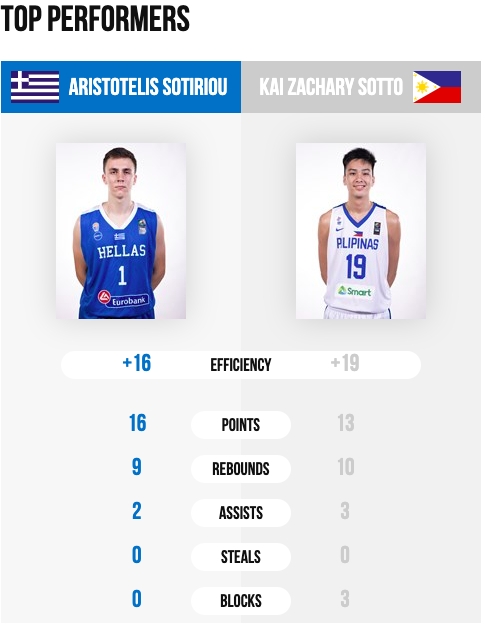 Durante el último partido de la jornada, el gigante, Kai Sotto, hizo su primera aparición en el Mundial con 13 puntos y 10 rebotes. los helenos sufrieron por llevarse la victoria, pero el gran juego colectivo en la segunda parte les permitió ampliar su ventaja hasta el final del partido.
