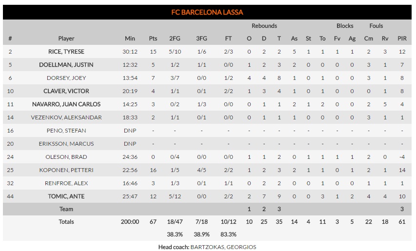 Quedaba un minuto por jugarse. Lojeski callaría al Palau Blaugrana con una bonita suspensión, pero Koponen iba a responder con un grandísimo triple desde la frontal (67-67). Con 7 segundos por jugarse, Vezenkov realizaba una falta. Mantzaris sería el encargado de tirar: los dos irían dentro (67-69). La última bola se la jugaría Rice, que fallaría una bandeja tras una buena defensa rival.