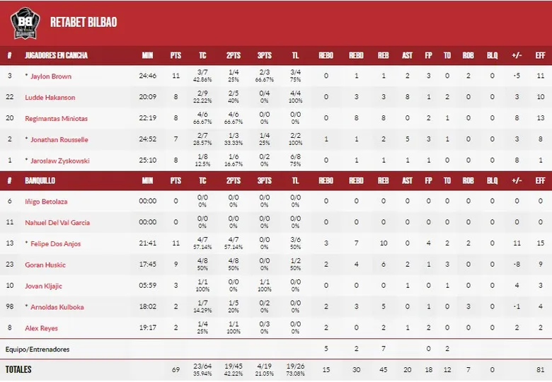 Ceguera absoluta de cara al aro. Los encargados de meter los puntos en ambos equipos no es que tuvieran la pólvora mojada., si no que directamente se la dejaron en casa. Pietro Aradori se marcó un 4 de 15, Fletcher y Withers sumaron un 1 de 9 y hasta su mejor jugador Ethan Happ falló muchos tiros claros cerca del aro con 8 de 16. Ya mejor ni hablar de los porcentajes generales de la Fortitudo con un 18% en triples y un 10 de 19 en triples. Pero es que RETAbet Bilbao Basket no estuvo mucho mejor con un 21% en triples y un 36% en tiros de campo, con Hakanson teniendo un 2 de 9, Zyskowski un 1 de 8 y Kulboka un 1 de 7.