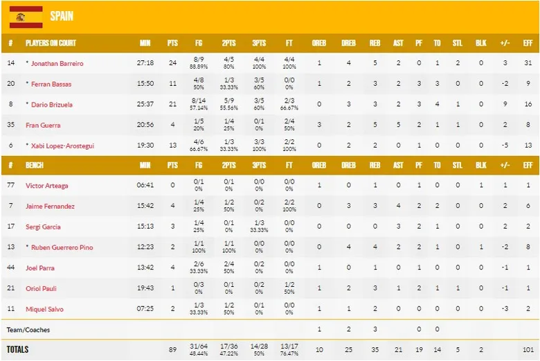 La selección ejecutó a la perfección estas dos facetas que forman parte del ABC del baloncesto. España sumó un total de 21 asistencias que se tradujeron en un fenomenal 14 de 28 en tiros de tres. Contínuamente se buscó al jugador mejor posicionado para tirar, con Fran Guerra destacando en esta faceta al liderar los pases de canasta con 5, y hasta otros 6 jugadores sumando 2 o más. En el apartado del tiro los destacados fueron Xabi López-Arostegui, con 2 de 2, y sobre todo Barreiro que sumó 4 sin fallo. Pero también Ferran Bassas y Brizuela estuvieron muy acertados, con 3 de 5 cada uno. El escolta de Unicaja sigue en estado de gracia y fue el jugador buscado en las jugadas claves, además de anotar 21 puntos. De no ser por por el partidazo de Barreiro, la Mamba Vasca habría sido el MVP.
