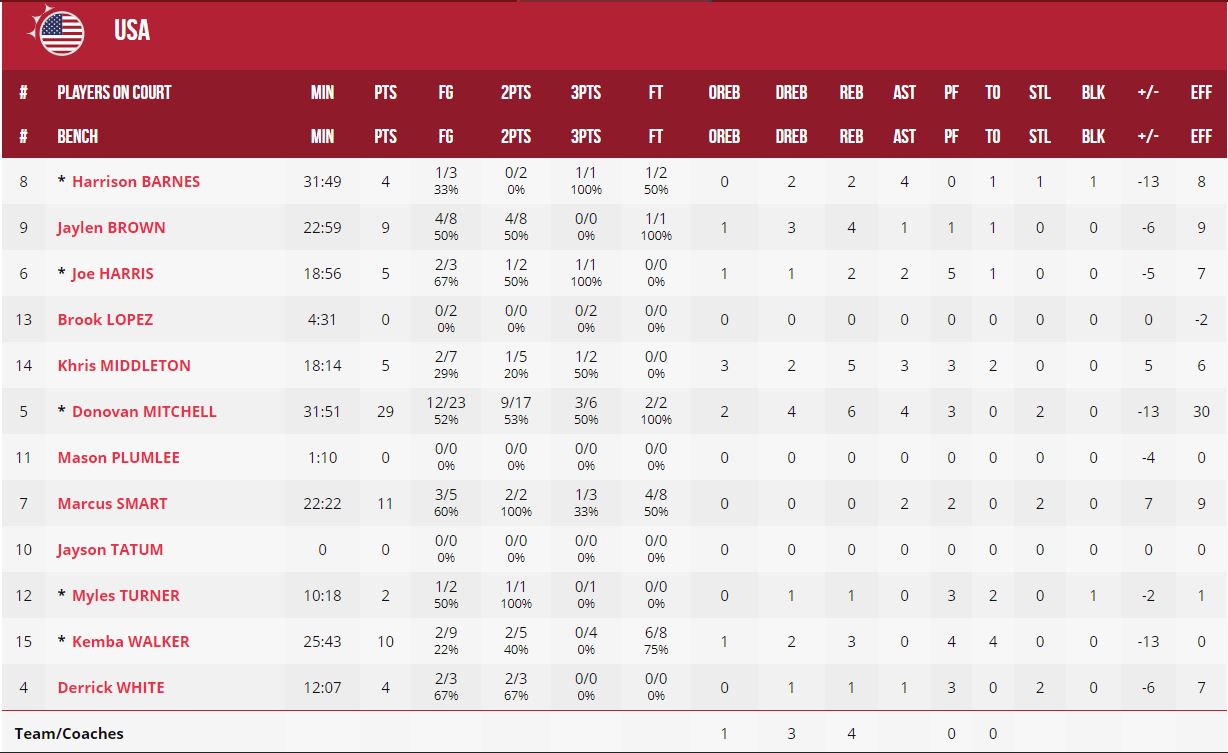 Donovan Mitchell, muy solo. Otro jugador de los Utah Jazz, el escolta Donovan Mitchell, completó su mejor actuación en el Mundial con 29 puntos, fruto de numerosos triples, entradas y tiros de media distancia. Sin embargo, llegado el último cuarto, Mitchell dejó de producir, y ninguno de sus compañeros conseguía sustituir su aportación. Especialmente decepcionante resultó Kemba Walker, que anotó solo 10 puntos, y falló varios tiros importantes, incluidos desde la personal, en el tramo final. Rendimiento por debajo de lo esperado del que se esperaba que fuese el líder de Estados Unidos en este Mundial.
