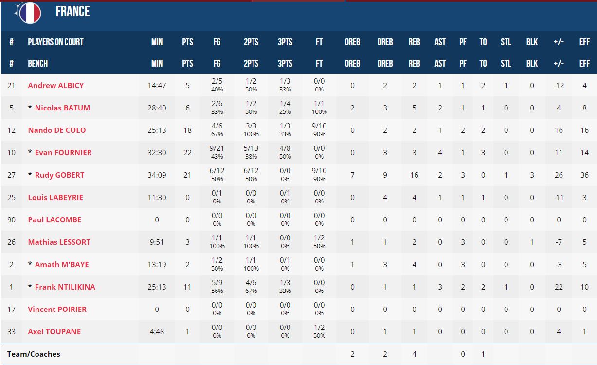 La línea exterior francesa dinamitó el partido. Si Gobert dominó el partido en las dos zonas, los exteriores franceses lo hicieron en distintos momentos del partido. Evan Fournier destacó más en la primera parte, en la que anotó 13 de sus 22 puntos; Ntilikina apareció en el momento más crítico para poner a Francia por delante en el último cuarto, y a De Colo, autor de 18 puntos, no le tembló el pulso con los tiros libres en el último minuto. Una histórica victoria basada en un gran equilibrio exterior e interior.