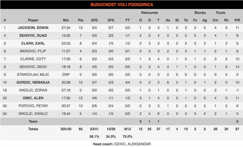 Segundo cuarto: Los jugadores de Buducnost no realizaron un mal partido, pero pagaron muy caro su horrible segundo cuarto. Con un parcial de 30 a 14, el Granca elevó el listón defensivo y los jugadores visitantes no lograron anotar con regularidad. Con Edwin Jackson defendido por Rabaseda y Clark con poca actividad y errático en el tiro de tres, los visitantes no encontraron referentes ofensivos que suplieran a los anotadores habituales. Además el Granca tuvo mucho acierto ofensivo y no les dio opciones de remontar, a pesar de la relajación defensiva en el último periodo.