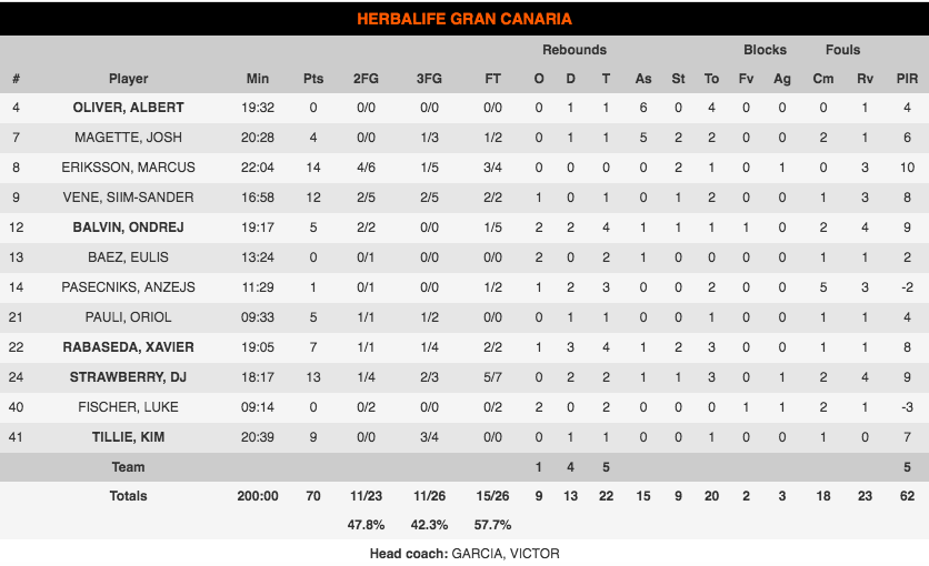 Fríos datos: Los porcentajes de tiro de Khimki rozaron el 70% en tiros de dos y el 50% en tiros de tres. 29 asistencias por 11 pérdidas del Khimki y 15 asistencias y 20 pérdidas del Granca. No solo en números fue muy superior el Khimki, la imagen y las sensaciones de ambos equipos fue muy diferente. Demasiados jugadores de la plantilla del Herbalife están ofreciendo un rendimiento por debajo de las expectativas. Strawberry, Tillie o Pasecniks son los más destacados en el apartado negativo, con actuaciones negativas un partido tras otro.
