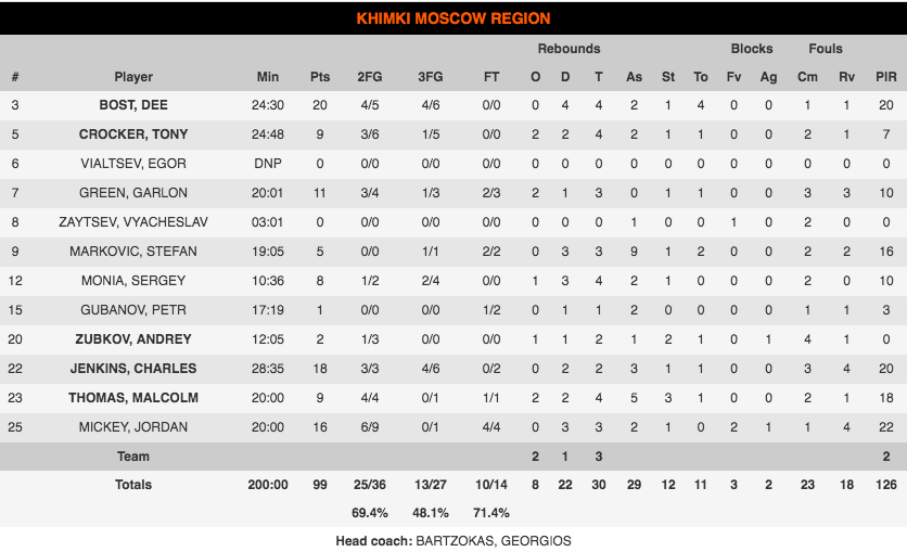 Clara superioridad: Sin sus principales jugadores, Shved y Gill, Bartzokas demostró tener una plantilla amplia y con muchos recursos. Sin un gran poderío en la pintura, se las ingeniaron para anotar con facilidad cerca del aro. Tanto los exteriores, sobre todo Bost, como los interiores (que no lo son tanto), como Thomas o Mickey, castigaron a la débil defensa amarilla con penetraciones y jugando al poste, aprovechando la ventaja física. Tampoco la defensa amarilla pudo detener a su arsenal de tiradores, liderados también por Bost. Hasta siete jugadores del Khimki llegaron a la decena de créditos de valoración.