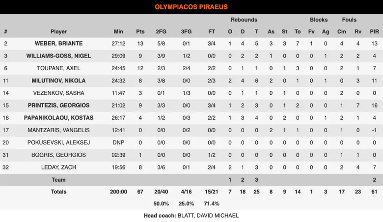 Sin líder: No están teniendo una buena temporada, tampoco cuando ha estado Spanoulis y se están jugando su presencia en play offs, por lo que este partido tenía una importancia vital para los del Pireo. Olympiacos, agobiado por la defensa del Granca, no consiguió hilvanar con fluidez su juego ofensivo en ningún momento. Ni siquiera en acciones individuales, los del Pireo lograron desestabilizar a la defensa amarilla. Williams-Goss lo intentó por momentos, como Toupane o Printezis, pero el nivel general del equipo de Blatt, ha sido decepcionante.