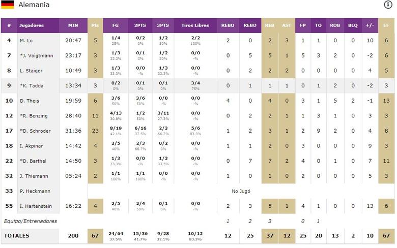 - Igualdad en la primera parte: Los primeros 20 minutos han estado muy igualados en todos los sentidos, mientras Alemania dependía del genio anotador de Schroder (23 puntos), Georgia se comportaba como un equipo guiado por Shengelia (12 puntos) y Dixon (5 asistencias). Acabaron los germanos con una ligera renta de 5 puntos al descanos gracias al acierto en el tiro exterior en el último minuto de juego.