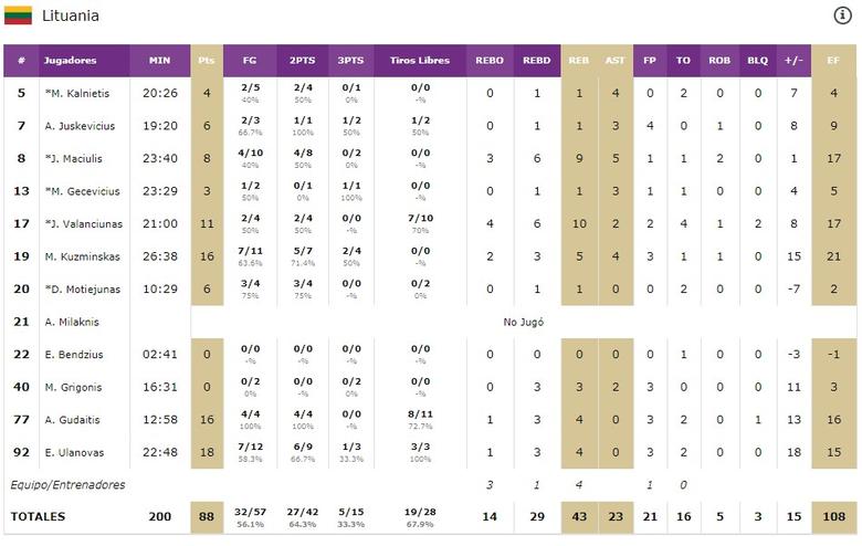 - Kuzminskas vuelve a liderar el ataque: El ex de Unicaja ya ha alcanzado el status de estrella de su selección. Cuenta con el beneplacito de seleccionador y compañeros y para jugarse los tiros que crea conveniente, y se está viendo beneficiado por jugar minutos como cuatro, ante la falta de jugadores de esa posición. Con su gran físico y compartiendo pista con Maciulis, entre los dos pueden aguantar en defensa, y en ataque son un quebradero de cabeza para interiores más lentos. Hoy no fue el máximo anotador ya que Ulanovas lo superó con 18 puntos, varios conseguidos con el partido ya decidido, pero si el segundo con 16 puntos y empatado con Gudaitis.