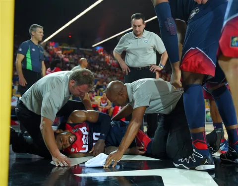 - Kyrie Irving se lastima la espalda: La única nota negra del partido para el Team USA fue la lesión del base de los Cavaliers en la recta final del encuentro. Se pegó un buen costalazo contra el parquet y se tuvo que retirado auxiliado por el staff USA con un fuerte golpe en la espalda que, por sus gestos y lenguaje conrporal, debía ser muy doloroso.