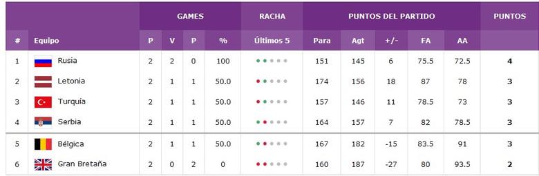 La segunda jornada deja a Rusia como único equipo invicto en el Grupo D. Sus importantes triunfos ante Serbia y Letonia les colocan en buena posición de cara a los cruces. Turquía venció a Gran Bretaña pero no acaba de despejar interrogantes. Mientras que Bélgica cayó ante Letonia en un atípico partido que se decidía en un último periodo donde los belgas sufrieron un tremendo apagón de acierto ofensivo.
