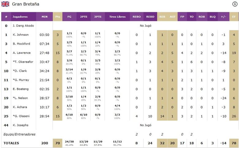 - Gabe Olaseni vuelve a brillar. El pívot de Montakit Fuenlabrada volvió a ser uno de los mejores jugadores del combinado británico. 15 puntos y 14 rebotes para alcanzar una valoración de 26 tantos para acompañar a Andrew Lawrence (15p) como jugadores más destacados de una Gran Bretaña que se mantuvo con opciones hasta mediado el último periodo pero que vio como finalmente Turquía cerraba el partido.