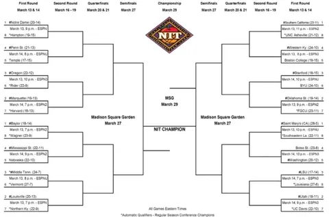 Pero además del March Madness también hay otros torneos de los que destaca la NIT. Este año ha quedado un cuadro mas que interesante con las universidades descartadas por el comité para el Gran Baile. Baylor, USC, Saint Mary´s y Notre Dame parten como favoritos en el National Invitation Tournament. Podremos ver a la Oklahoma State de Yankuba Sima con el seed #2 enfrentarse en primera ronda a FGCU. Aqui el cuadro de la NIT: